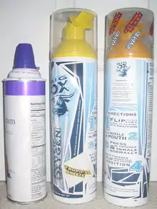 A number of gases intended for household or industrial use are inhaled as recreational drugs. This includes chlorofluorocarbons used in aerosols and propellants (e.g., aerosol hair spray, aerosol deodorant). A gas used as a propellant in whipped cream aerosol containers, nitrous oxide, is used as a recreational drug. Pressurized canisters of propane and butane gas, both of which are intended for use as fuels, are used as inhalants.