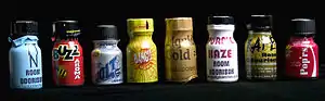 In the United Kingdom, poppers are widely available and frequently (legally) sold in gay clubs/bars, sex shops, drug paraphernalia head shops, over the Internet and on markets.[46] It is illegal under Medicines Act 1968 to sell them advertised for human consumption, and to bypass this, they are usually sold as odorizers. In the U.S., originally marketed as a prescription drug in 1937, amyl nitrite remained so until 1960, when the Food and Drug Administration removed the prescription requirement due to its safety record. This requirement was reinstated in 1969, after observation of an increase in recreational use. Other alkyl nitrites were outlawed in the U.S. by Congress through the Anti-Drug Abuse Act of 1988. The law includes an exception for commercial purposes. The term commercial purpose is defined to mean any use other than for the production of consumer products containing volatile alkyl nitrites meant for inhaling or otherwise introducing volatile alkyl nitrites into the human body for euphoric or physical effects.[47] The law came into effect in 1990. Visits to retail outlets selling these products reveal that some manufacturers have since reformulated their products to abide by the regulations, through the use of the legal cyclohexyl nitrite as the primary ingredient in their products, which are sold as video head cleaners, polish removers, or room odorants.