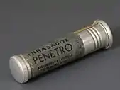 In 1968, Robert Wexler of Abbott Laboratories developed the Analgizer, a disposable inhaler that allowed the self-administration of methoxyflurane vapor in air for analgesia.[16] The Analgizer consisted of a polyethylene cylinder 5 inches long and 1 inch in diameter with a 1 inch long mouthpiece. The device contained a rolled wick of polypropylene felt which held 15 milliliters of methoxyflurane.