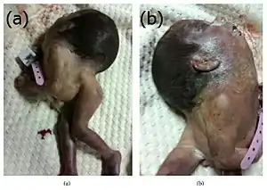 Iniencephaly is a rare type of cephalic disorder[1][2] characterised by three common characteristics: a defect to the occipital bone, spina bifida of the cervical vertebrae and retroflexion (backward bending) of the head on the cervical spine.[3] Stillbirth is the most common outcome, with a few rare examples of live birth, after which death almost invariably occurs within a short time.
