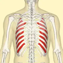 The innermost intercostal muscle is a layer of intercostal muscles.[1] It may also be called the intima of the internal intercostal muscles.[2] It is the deepest muscular layer of the thorax,[3] with muscle fibres running vertically (in parallel with the internal intercostal muscles).[2] It is present only in the middle of each intercostal space, and often not present higher up the rib cage.[3] It lies deep to the plane that contains the intercostal nerves and intercostal vessels, and the internal intercostal muscles.[3][4] The diaphragm is continuous with the innermost intercostal muscle.[5]
