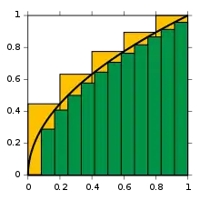 Approximations to integral of x from 0 to 1, with 5 yellow right endpoint partitions and 12 green left endpoint partitions