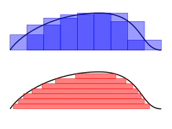 Riemann–Darboux's integration (top) and Lebesgue integration (bottom)