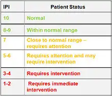 The IPI incorporates four patient parameters (end-tidal CO2 and respiratory rate measured by capnography, as well as pulse rate and blood oxygenation SpO2 as measured by pulse oximetry) into a single index value.[1] The IPI value on the patient monitor indicates the patient ventilatory status, where a score of 10 is normal, indicating optimal pulmonary status, and a score of 1 or 2 requires immediate intervention.