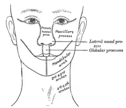 ![]() Diagram showing the regions of the adult face and neck related to the fronto-nasal process and the branchial arches. (Globular processes labeled at center right.) | |