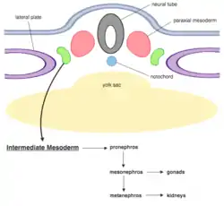 Intermediate mesoderm or intermediate mesenchyme is a narrow section of the mesoderm (one of the three primary germ layers) located between the paraxial mesoderm and the lateral plate of the developing embryo.[1] The intermediate mesoderm develops into vital parts of the urogenital system (kidneys, gonads and respective tracts), as well as the reproductive system.