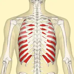 The internal intercostal muscles (intercostales interni) are a group of skeletal muscles located between the ribs. They are eleven in number on either side. They commence anteriorly at the sternum, in the intercostal spaces between the cartilages of the true ribs, and at the anterior extremities of the cartilages of the false ribs, and extend backward as far as the angles of the ribs, hence they are continued to the vertebral column by thin aponeuroses, the posterior intercostal membranes.They pull the sternum and ribs upward and inward.