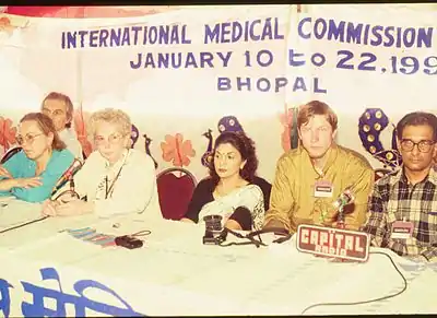 Recognising the dire need of the gas victims, the Permanent Peoples' Tribunal met in 1992 and recommended that an international medical commission provide an in-depth independent assessment of the situation in Bhopal. In 1993, the Bhopal Group for Information and Action (BGIA) made a proposal.[2] The International Medical Commission on Bhopal (IMCB) was thus constituted with 14 professionals from 12 countries who were chosen on the basis of their medical expertise and experience in environmental health, toxicology, neurology, immunology, respiratory medicine and family medicine. Drs. Rosalie Bertell and Gianni Tognoni served as the co-chairpersons of the IMCB. At the request of Carbide gas victim organisations, the IMCB conducted a humanitarian visit to India in January 1994 to contribute in any way possible to the relief of the victims and to suggest ways to in which such catastrophic accidents could be prevented in the future or their effects mitigated. During their stay, the IMCB met with government officials, various disaster experts, hospitals, research teams, local private physicians, biochemists, botanists, various survivor groups, environmental activists and veterinarians.