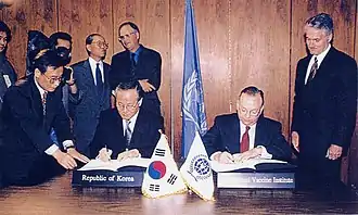 On October 28, 1996, the IVI Establishment Agreement opened for signatures at the UN headquarters in New York City. Representatives of Bangladesh, Bhutan, Indonesia, Kazakhstan, Mongolia, the Netherlands, Panama, Republic of Korea, Romania, Thailand, Vietnam, Uzbekistan, and the WHO were the first to sign the agreement, followed shortly thereafter by Senegal and the Philippines.