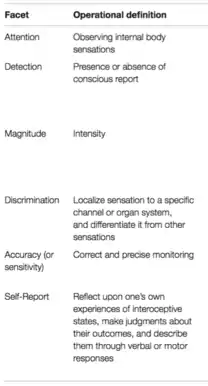 Although interoception as a term has more recently gained increased popularity, different aspects of it have been studied since the 1950s. These include the features of attention, detection, magnitude, discrimination, accuracy, sensibility, and self-report.[1][26] Despite not using the word "interoception" specifically, many publications in the physiology and medical fields have focused on understanding interoceptive information processing in different organ systems. Attention describes the ability to observe sensations within the body, it can be directed voluntarily in a "top down" manner or it can be attracted involuntarily in a "bottom up" manner. Detection reflects the presence or absence of a conscious report of interoceptive stimuli, like a heartbeat or growling stomach. Magnitude is the intensity of the stimulus, or how strongly the stimuli is felt. Discrimination describes the ability to localize interoceptive stimuli in the body to specific organs and differentiate them from other bodily stimuli that also occur, like distinguishing between a heart which is beating hard from an upset stomach. Accuracy (or sensitivity) refers to how precisely and correctly an individual can monitor specific interoceptive processes. Self-report is itself multifaceted. It describes the ability to reflect on interoceptive experiences occurring over different periods of time, make judgments about them, and describe them. Brain-body interactions can also be studied using neuroimaging techniques to map functional interactions between brain and peripheral signals. Although all of these components of interoception have been studied since the mid-twentieth century, they have not been brought together under the umbrella-term "interoception" until more recently.[1] The term "interoceptive awareness" is also frequently used to encompass any (or all) of the different interoception features that are accessible to conscious self-report. This multifaceted approach offers a unified way of looking at interoceptive functioning and its different features, it clarifies the definition of interoception itself, and it informs structured ways of assessing interoceptive experiences in an individual.