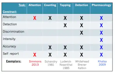 Cardiac interoception has been widely studied as a method of evaluating interoceptive sensation. This is done using different tasks including heartbeat counting,[10] heartbeat tapping,[19] heartbeat detection[27][28] and heartbeat attention[29][30] tasks. Heartbeat counting tasks ask participants to count the number of felt heartbeats during short time periods. Their reported count is then compared with the actual count obtained with an electrocardiogram. This measures the participant's attention to his or her own heartbeat, the accuracy with which that is perceived, and the ability of the participant to report that measurement; however, results can be influenced by the participant's preexisting knowledge of his or her heart rate[31][32] and an insensitivity to heart rate change.[33] Heartbeat detection tasks work by providing a participant with a musical tone which is played simultaneously or non-simultaneously with one's heartbeat, asking the participant to report whether it is simultaneous or not with the tones. Heartbeat detection is commonly used because of its ability discern an individual's performance above chance levels, so-called "good detectors". However, such detection rates among participants for this task are usually only 35%.[1] It also measures the participant's attention, detection, discrimination, accuracy and self-report of the interoceptive process.[1] Heartbeat attention tasks are the most minimalistic, and involve simply the top-down direction of attention towards an interoceptive sensation such as the heartbeat, breath, or stomach.[29] Most perceptions of heartbeat sensations usually occur during a time of homeostatic perturbation, such as when the state of the body changes from external or internal influences such as physical exertion or elevated arousal states (e.g., riding a roller coaster, watching a scary movie, public speaking anxiety, or having a panic attack). For this reason, cardiac interoception is also sometimes studied by inducing perturbations of bodily state. This can be done pharmacologically using adrenaline-like drugs, such as isoproterenol, which mimics activation of the sympathetic nervous system,[11] resulting in increased heart rate and respiration rate, similar to the "fight-or-flight" response.[34][35] This approach provides a physiological basis for understanding psychiatric and neurological disorders that are characterized by heightened sympathetic nervous system activity.[11]