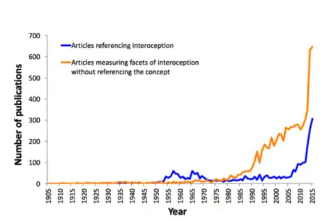 The twenty-first century has seen an exponential increase in publications on the topic of interoception, and a recognition of the multifaceted nature of this concept.[1] With a renewed interest in research, different ideas about interoception have emerged. One definition widens the concept to encompass "the skin and all that is underneath the skin" and the perception and function of bodily activity[3] to more fully understand psychosomatic processes.[9] In a similar vein, neuroanatomists hoping to find the anatomical basis of interoceptive functioning have stated the existence of a homeostatic pathway from the body to the brain that represents "the physiological status of all tissues in the body" and that this mapping onto the brain provides an individual with subjective feeling states which are critical for human emotion and self-awareness.[2]