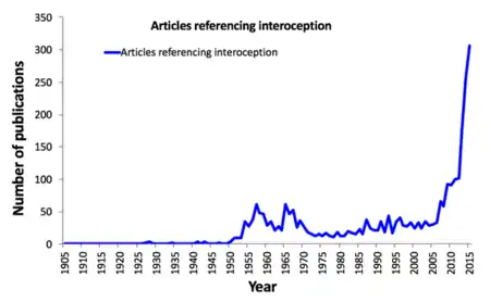 The late 1950s and the 1960s saw an increased interest in interoception based on the number of publications released during that time period that referenced the term. This increase has been referred to as the "biofeedback blip", where researchers examined the ability of a person to gain control over autonomic functions as a method of treatment for varying conditions.[16]