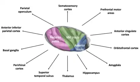The insula is critically involved in the processing, integration, and cortical representation of visceral and interoceptive information. Lamina I spinothalamic and vagal afferents project via the brainstem and thalamus to the posterior and mid dorsal insula respectively. From there, information travels to the posterior and mid-insula, which combines visceral and somatosensory information.[29] The insula is also activated during a variety of exteroceptive and affective tasks. The insula is considered to be a "hub" region because it has an extremely high number of connections with other brain areas, suggesting it may be important for an integration of lower-level physiological information and salience.[47]