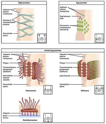 Important for the barrier function of intestinal epithelium, its cells are joined securely together by four types of junctions (cell junctions),[13] which can be identified at the ultrastructural level:[14]