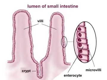 Drawing showing the relationship between villi and microvilli of the small intestine. The luminal surface of the enterocytes have microvilli (1 micrometer long) while the cell layer itself is folded to form villi (0.5-1.6 millimeters long) and crypts. Both serve to increase the total absorption surface of the intestine.