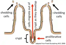 Epithelial cells are continuously renewed every 4–5 days through a process of cell division, maturation, and migration. Renewal relies on proliferative cells (stem cells) that reside at the crypt (base) of the intestinal glands (epithelial invaginations into the underlying connective tissue).[1] After being formed at the base, the new cells migrate upwards and out of the crypt, maturing along the way. Eventually, they undergo apoptosis and are shed off into the intestinal lumen.[2] In this way, the lining of the intestine is constantly renewed while the number of cells making up the epithelial layer remains constant.[3]