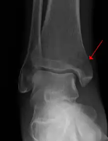 Example of an intraarticular fracture of the medial malliolus extending in the talocrural ankle joint.