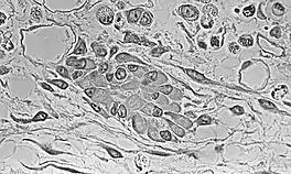 The process of intramembranous ossification starts when a small group of adjacent MSCs begin to replicate and form a small, dense cluster of cells that is called a nidus.[lower-alpha 1] Once a nidus has been formed the MSCs within it stop replicating. At this point, morphological changes in the MSCs begin to occur: The cell body is now larger and rounder; the long, thin cell processes are no longer present; and the amount of Golgi apparatus and rough endoplasmic reticulum increases. Eventually, all of the cells within the nidus develop into, and display the morphologic characteristics of, an osteoprogenitor cell.[1]