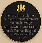 Plaque at St Thomas' Hospital – site of first permanent insertion of an intraocular lens, 8 February 1950