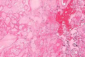 | Micrograph of a placental infarct (left of image), a cause of intrauterine hypoxia. H&E stain. | |