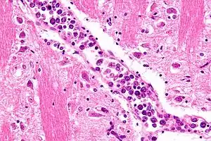 Micrograph showing an intravascular large B-cell lymphoma in a blood vessel of the brain. H&E stain.