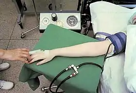 ![]() Intravenous regional anesthesia (IVRA) using older tourniquet equipment. Modern electronic instruments include more safety features specifically for IVRA. | |