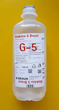 Intravenous sugar solution, also known as dextrose solution, is a mixture of dextrose (glucose) and water.[1] It is used to treat low blood sugar or water loss without electrolyte loss.[2] Water loss without electrolyte loss may occur in fever, hyperthyroidism, high blood calcium, or diabetes insipidus.[2] It is also used in the treatment of high blood potassium, diabetic ketoacidosis, and as part of parenteral nutrition.[2] It is given by injection into a vein.[2]