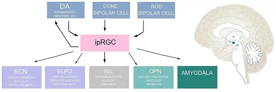 Other post synaptic targets of ipRGCs include: the intergenticulate leaflet (IGL), a cluster of neurons located in the thalamus, which play a role in circadian entrainment; the olivary pretectal nucleus (OPN), a cluster of neurons in the midbrain that controls the pupillary light reflex; the ventrolateral preoptic nucleus (VLPO), located in the hypothalamus and is a control center for sleep; as well as to the amygdala.[1]