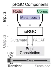 Using various photoreceptor knockout mice, researchers have identified the role of ipRGCs in both the transient and sustained signaling of the pupillary light reflex (PLR).[15] Transient PLR occurs at dim to moderate light intensities and is a result of phototransduction occurring in rod cells, which provide synaptic input onto ipRGCs, which in turn relay the information to the olivary pretectal nucleus in the midbrain.[16] The neurotransmitter involved in the relay of information to the midbrain from the ipRGCs in the transient PLR is glutamate. At brighter light intensities the sustained PLR occurs, which involves both phototransduction of the rod providing input to the ipRGCs and phototransduction of the ipRGCs themselves via melanopsin. Researchers have suggested that the role of melanopsin in the sustained PLR is due to its lack of adaptation to light stimuli in contrast to rod cells, which exhibit adaptation. The sustained PLR is maintained by PACAP release from ipRGCs in a pulsatile manner.[15]