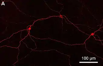 ipRGCs are both pre- and postsynaptic to dopaminergic amacrine cells (DA cells) via reciprocal synapses, with ipRGCs sending excitatory signals to the DA cells, and the DA cells sending inhibitory signals to the ipRGCs. These inhibitory signals are mediated through GABA, which is co-released from the DA cells along with dopamine. Dopamine has functions in the light-adaptation process by up-regulating melanopsin transcription in ipRGCs and thus increasing the photoreceptor's sensitivity.[1] In parallel with the DA amacrine cell inhibition, somatostatin-releasing amacrine cells, themselves inhibited by DA amacrine cells, inhibit ipRGCs.[12] Other synaptic inputs to ipRGC dendrites include cone bipolar cells and rod bipolar cells.[9]