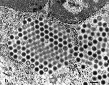 Iridoviridae is a family of viruses with double-stranded DNA genomes.[1] Amphibians, fish, and invertebrates such as arthropods serve as natural hosts. There are currently 19 species in this family, divided among two subfamilies and six genera.[1][2]