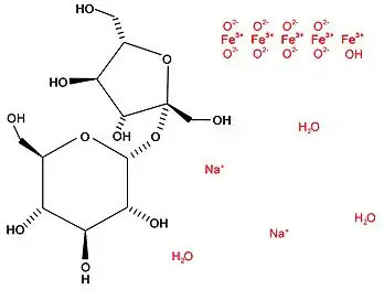 Structure of iron sucrose. Sucrose molecule is black, and iron complex and ions in solution are red.