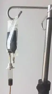 Iron sucrose is a dark brown liquid solution. It is administered intravenously and is only used when a patient with iron deficiency cannot be treated using oral iron options.[5] It is a generally effective drug, with more than 80% of patients responding to treatment. Iron sucrose has ~20 mg of iron per mL of solution. A typical adult patient can safely receive 600 mg of iron sucrose per week, administered in separate doses of 200–300 mg. Most patients experience an increase in their hemoglobin levels of at least 20 g/L.[3] Administration usually takes from fifteen to thirty minutes[3] and is done by a medical professional. Often, saline solution is mixed with the iron sucrose during injection.[6]