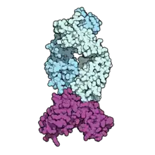 ![]() Isatuximab (pale blue) binding CD38 (purple). PDB: 4CMH | |