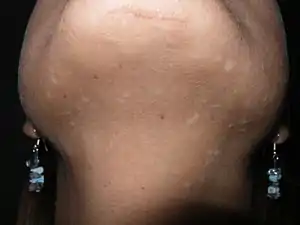 | Macular and slightly papular lesions over the chin, mandibular and anterior cervical region |
