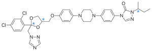 The itraconazole molecule has three chiral carbons. The two chiral centers in the dioxolane ring are fixed in relation to one another, and the triazolomethylene and aryloxymethylene dioxolane-ring substituents are always cis to each other. The clinical formulation is a 1:1:1:1 mixture of four stereoisomers (two enantiomeric pairs).[32][33]