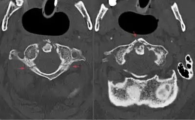 A Jefferson fracture is a bone fracture of the anterior and posterior arches of the C1 vertebra,[1] though it may also appear as a three- or two-part fracture. The fracture may result from an axial load on the back of the head or hyperextension of the neck (e.g. caused by diving), causing a posterior break, and may be accompanied by a break in other parts of the cervical spine.[1]
