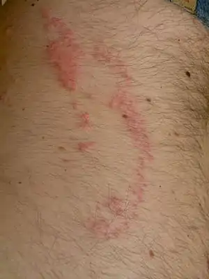 | Jellyfish dermatitis in back abdominal skin. Jellyfish of Mediterranean sea. | |