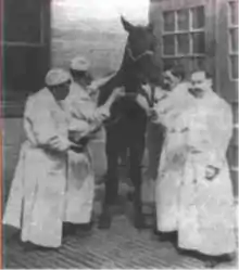 "Jim" was the name of a former milk wagon horse, who was used to produce serum containing diphtheria antitoxin (antibodies against diphtheria toxin). Jim produced over 30 US quarts (7.5 US gallons; 28.5 litres) of diphtheria antitoxin in his career. However, on October 2, 1901, Jim showed signs that he had contracted tetanus and was euthanized. After the death of a girl in St. Louis was traced back to Jim's contaminated serum, it was discovered that serum dated September 30 contained tetanus in its incubation phase. This contamination could have easily been discovered if the serum had been tested prior to its use. Furthermore, samples from September 30 had also been used to fill bottles labeled "August 24," while actual samples from the 24th were shown to be free of contamination.[1]
