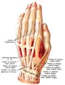 In human anatomy, juncturae tendinum or connexus intertendinei refers to the connective tissues that link the tendons of the extensor digitorum communis, and sometimes, to the tendon of the extensor digiti minimi.[1] Juncturae tendinum are located on the dorsal aspect of the hand in the first, second and third inter-metacarpal spaces proximal to the metacarpophalangeal joint.