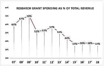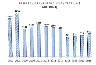 In 2018, JDRF provided $85 million (37% of their total income) to T1D scientific research grants, they provided $156.4 million (67% of their total income) in 2008.[14]