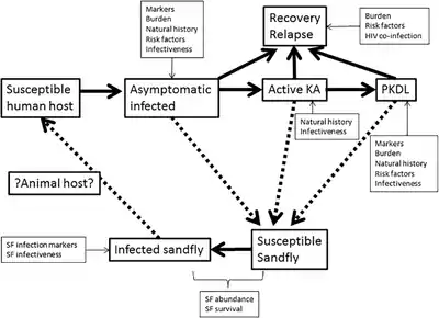 People get the disease from the bites of sandflies which themselves got a parasite from drinking blood of another person infected with the parasite. Globally there are more than 20 different Leishmania parasites which cause the disease and 90 species of sandfly which spread those parasites.[2] In the Indian subcontinent, however, there is only one common species of parasite, Leishmania donovani and only one species of sandfly, Phlebotomus argentipes, which spreads the disease.[3] The form of the disease, the medicine for eliminating the parasite, and insecticide for preventing the insect bite varies by region, and there are recommendations in place for India.[4]