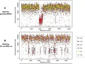 In molecular biology, kataegis describes a pattern of localized hypermutations identified in some cancer genomes, in which a large number of highly-patterned basepair mutations occur in a small region of DNA.[1] The mutational clusters are usually several hundred basepairs long, alternating between a long range of C→T substitutional pattern and a long range of G→A substitutional pattern. This suggests that kataegis is carried out on only one of the two template strands of DNA during replication.[1] Compared to other cancer-related mutations, such as chromothripsis, kataegis is more commonly seen; it is not an accumulative process but likely happens during one cycle of replication.[2]