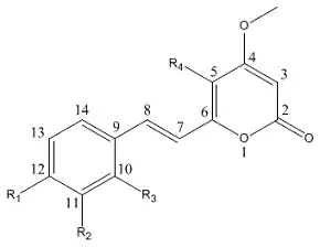 The general structure of the kavalactones, without the R1-R2 -O-CH2-O- bridge and with all possible C=C double bonds shown.