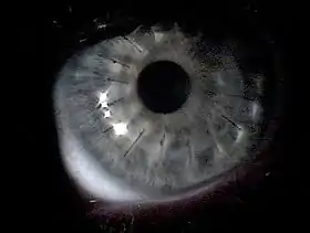 If keratoconus is suspected, the ophthalmologist or optometrist will search for other characteristic findings of the disease by means of slit lamp examination of the cornea.[26] An advanced case is usually readily apparent to the examiner, and can provide for an unambiguous diagnosis prior to more specialized testing. Under close examination, a ring of yellow-brown to olive-green pigmentation known as a Fleischer ring can be observed in around half of keratoconic eyes.[39] The Fleischer ring, caused by deposition of the iron oxide hemosiderin within the corneal epithelium, is subtle and may not be readily detectable in all cases, but becomes more evident when viewed under a cobalt blue filter.[10] Similarly, around 50% of subjects exhibit Vogt's striae, fine stress lines within the cornea caused by stretching and thinning.[39] The striae temporarily disappear while slight pressure is applied to the eyeball.[10] A highly pronounced cone can create a V-shaped indentation in the lower eyelid when the person's gaze is directed downwards, known as Munson's sign.[9] Other clinical signs of keratoconus will normally have presented themselves long before Munson's sign becomes apparent,[40] and so this finding, though a classic sign of the disease, tends not to be of primary diagnostic importance.