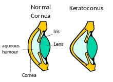 Keratoconus (KC) is a disorder of the eye that results in progressive thinning of the cornea.[3] This may result in blurry vision, double vision, nearsightedness, irregular astigmatism,[4] and light sensitivity leading to poor quality-of-life.[3][5] Usually both eyes are affected.[3] In more severe cases a scarring or a circle may be seen within the cornea.[6]