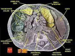 Images showing the human trunk, with positions of the organs show, and kidneys seen at the vertebral level of T12 to L3.