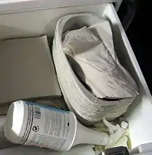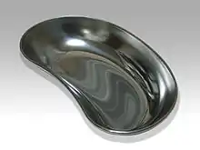 A kidney dish (British English) or emesis basin (American English) is a shallow basin with a kidney-shaped base and sloping walls used in medical and surgical wards to receive soiled dressings and other medical waste. Reusable kidney dishes are usually made of stainless steel, while disposable ones may be made of paper pulp or plastic. The shape of the dish allows it to be held against the patient's body to catch any falling fluids or debris. Various sizes of emesis basin are a common sight in healthcare settings, including facilities such as nursing homes that may have bedridden patients. The disposable version of the kidney dish was invented by Bessie Virginia Blount.