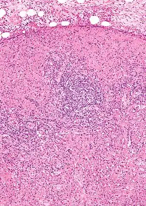 | Micrograph of a lymph node with Kikuchi disease showing the characteristic features (abundant histiocytes, necrosis without neutrophils). H&E stain. | |